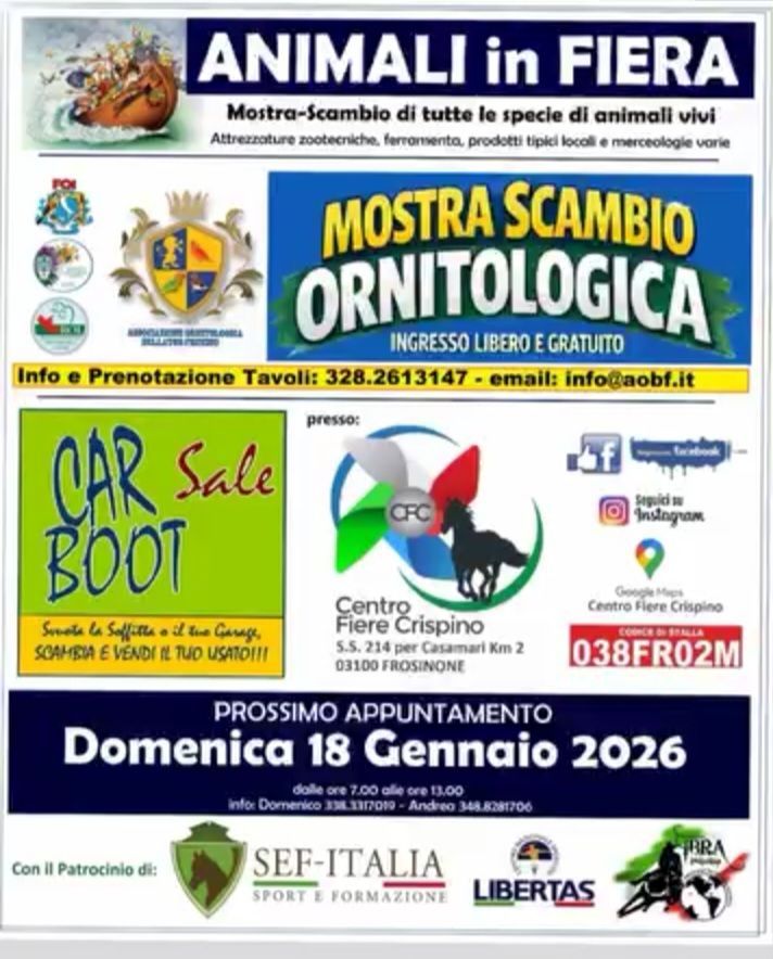 Domenica 18 gennaio 2026, il Centro Fiere Crispino di Frosinone ospita l'attesa Mostra Scambio Ornitologica. Organizzato dall’Associazione Ornitologica Bellator Frusino (A.O.B.F.), l'evento si svolgerà dalle ore 08:30 alle 14:00 ed è pensato come una giornata imperdibile per le famiglie e gli appassionati di natura.