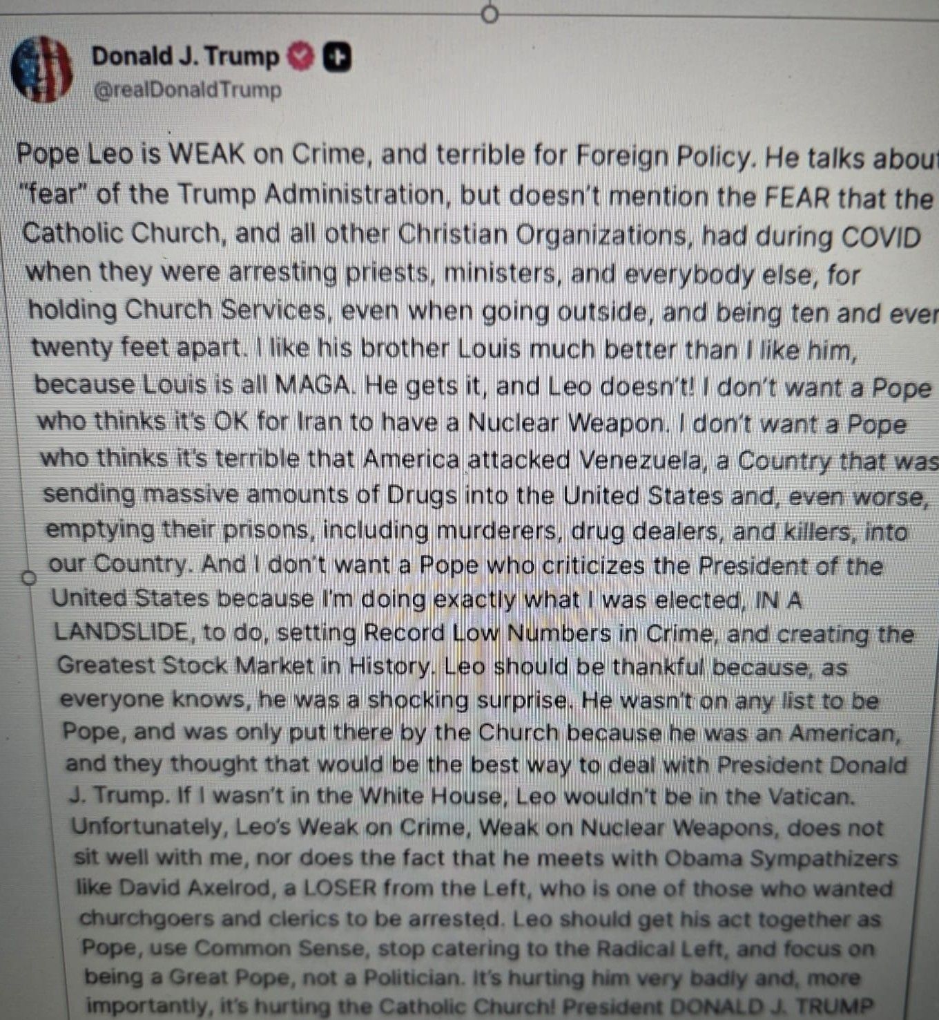 Nel messaggio si continua: “Purtroppo, Leone è debole sulla criminalità, debole sulle armi nucleari, e questo non mi va bene. Né mi va bene il fatto che incontri simpatizzanti di Obama come David Axelrod, un perdente della sinistra, uno di quelli che volevano far arrestare fedeli e religiosi. Leone dovrebbe darsi una regolata come Papa, usare il buon senso, smettere di assecondare la sinistra radicale e concentrarsi sull’essere un grande Papa, non un politico. Questo lo sta danneggiando molto e, cosa ancora più importante, sta danneggiando la Chiesa cattolica!”
